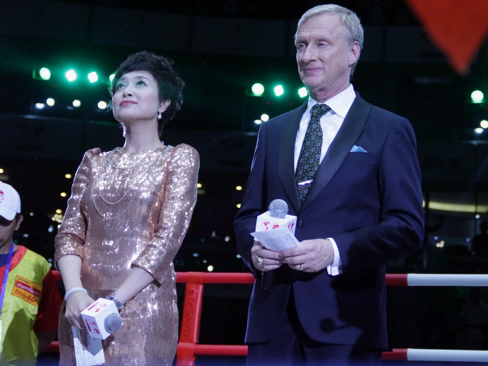 今回の試合の4日前、米国ラスベガスの4大世界戦のひとつ、ジャーメル・チャーロ(米)対ジョン・ジャクソン(バージン諸島)のWBCスーパーウェルター級王座決定戦でリングアナウンサーを務めたジミー・レノン・ジュニア氏(右)。主審のトニー・ウィークス氏と、ふたりともラスベガス興行が終わってから滑り込みで北京入りした。レノン氏の隣は中国語のアナウンサー。会場内にはバイリンガルなアナウンスが響いた。