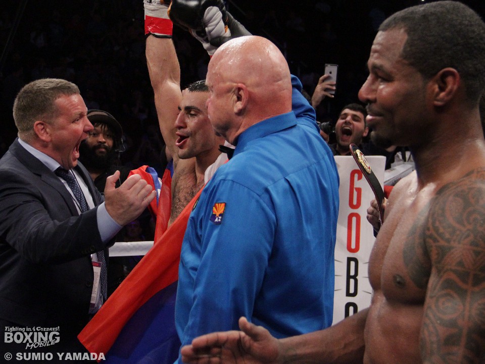 盛り上がったまま試合は終了した。採点はジャッジひとりが114対113の1ポイント差だったが、残る二者は117対110と明確な差をつけて王者の勝利を支持した。米国のリング初登場のアバネシャンは24戦22勝(11KO)1敗1分、史上4番目の年長戴冠を逃したモズリーは61戦49勝(41KO)10敗1分1無効試合。