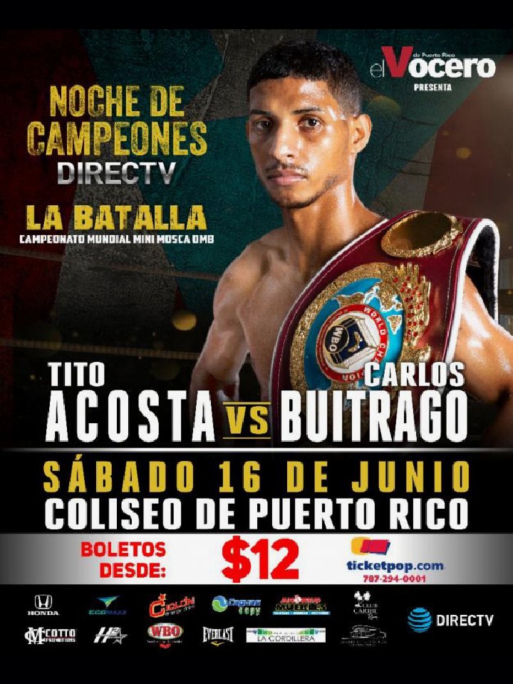 田中恒成(畑中)に破れた後の返上王座を獲得したアコスタと、京口紘人(ワタナベ)に破れて以来の再起戦が世界再挑戦となるブイトラゴの対決。プロモーターはプエルトリコ人初の4階級制覇王者となった英雄ミゲール・コットのミゲールコットプロモーションズが主催、同国ではPPVで放送される。