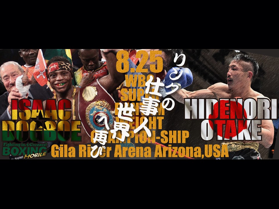 19日に羽田空港から決戦の地、米国・アリゾナ州に発った大竹。これが14年11月に英国でスコット・クイッグ(英国)に挑戦し判定負けして以来、2度目の世界挑戦となる。復帰後はOPBF王座を獲得するなど9連勝。約4年ぶりの世界挑戦となった。対する王者のドグボエは元オリンピアン。1月にWBO暫定王座決定戦でWBO1位のセサール・フアレス(メキシコ)に5回TKO勝ち。4月に正規王者のジェシー・マグダレノ(米)との王座統一戦で11回TKO勝ちし、正規王座へ昇格した。出身国ガーナの英雄、元世界2階級制覇王者のアズマー・ネルソン氏の再来とも呼ばれる若き王者に、37歳の叩き上げ大竹が挑む!
