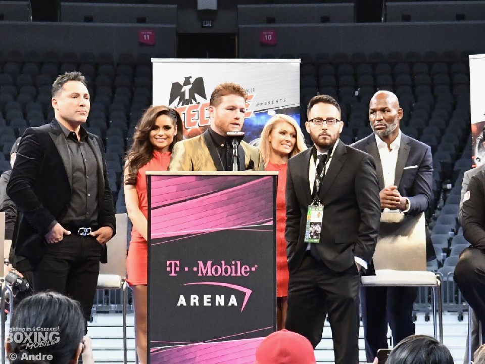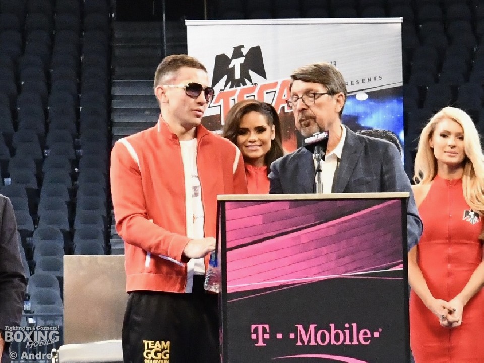 最初に登壇したゴロフキンは「今日誰が勝ったのか、私の口からは言わない。ジャッジが決めたことだからね。今日の試合はとてもエキサイティングだったし、お客さんの興奮も伝わった。私のできるすべてを出したし、カネロ(アルバレス)にはおめでとうと言いたい」と穏やかな表情で勝者を讃えた。戦術については「特に変えていない。彼がボディを狙ってくることはわかっていた、対応はできていたと思う」と悔しさをにじませた。再戦については「私はいつでも受けます。条件さえ合えばね」と笑顔を見せると最後に「また、会いましょう。私は帰ってきます。皆さんありがとう」と復帰を示唆して会場を後にした。