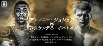 スポーツ・チャンネル「DAZN(ダゾーン)」が、10 月に独占ライブ中継を行う村田諒太選手の防衛戦に先駆けて、2018 年 9 月 22 日(日本時間 9 月 23 日)、ロンドンのウェンブリー・スタジアムで開催される、WBA スーパー・IBF・WBO 統一ヘビー級王者アンソニー・ジョシュア選手(英) vs アレクサンデル・ポベトキン選手(ロシア)のタイトルマッチを独占ライブ中継することを正式に発表した。