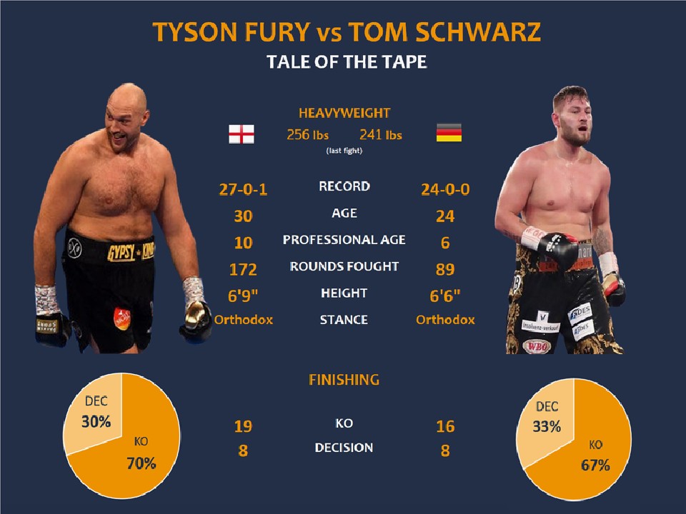 ヘビー級12回戦として行われる再起の舞台、フューリーは119.2kgをマーク。対するシュワルツはフューリーより7.9kg軽い111.3kgで秤を下りた。昨年12月にWBC(世界ボクシング評議会)同級王者デオンタイ・ワイルダー(米国)に挑戦し、試合をコントロールするも最終12ラウンドに2度のダウンを喫して絶体絶命の中、脅威の回復をみせ引き分け決着となったフューリー。その後はトップランク社と米国での試合契約を交わした。対するシュワルツはチェコ共和国出身でドイツを主戦場に戦う24戦全勝(16KO)の24歳。ジョシュアvsルイスJr戦に続くヘビー級アップセットを狙う。