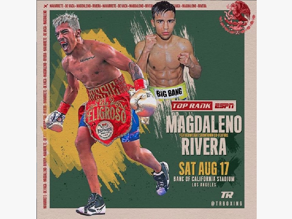 フェザー級10回戦で行われる元WBO世界スーパーバンタム級王者ジェシー・マグダレノ(米)の再起第2戦目は、元世界挑戦者ラファエル・リベラ(メキシコ)が相手となった。同級リミットの57.1kgを、マグダレノは300g軽い56.8kgでクリア。対するリベラは200gアンダーの56.9kgで合格した。プロモートを行うのは米国のトップランク社と、メキシコのザンファー・プロモーションズ。ストリーミング配信サービスのESPN+が中継を行う。