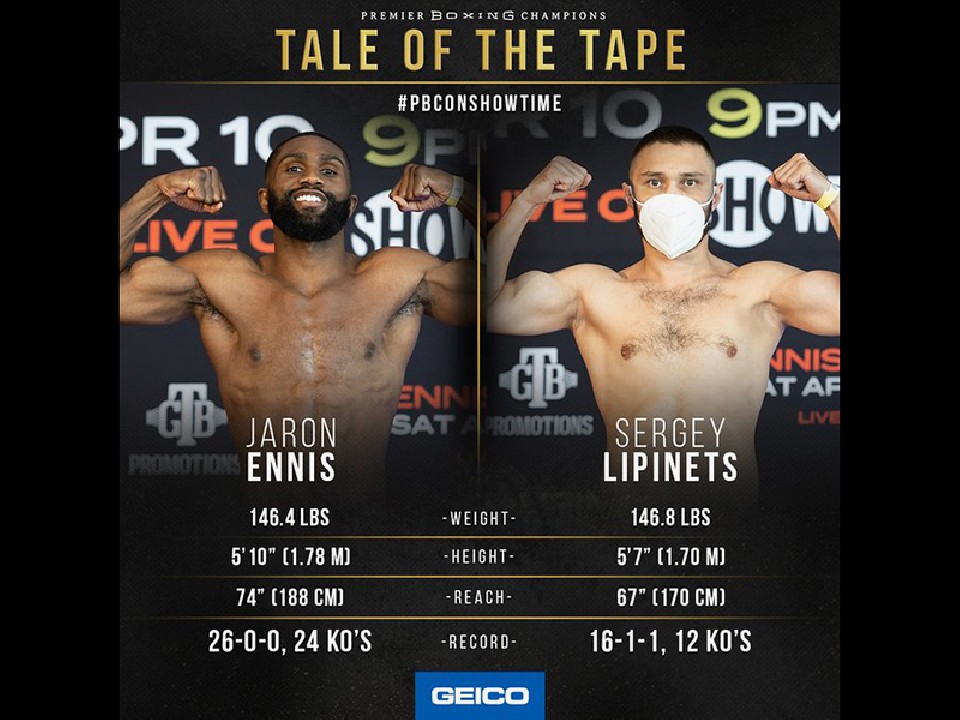 また、この日のメインイベントでは注目のウェルター級プロスペクト、WBO同級7位のジャロン・エニス(23=米)が、元IBF世界スーパーライト級王者セルゲイ・リピネッツ(32=ロシア)と同級12回戦を行う。