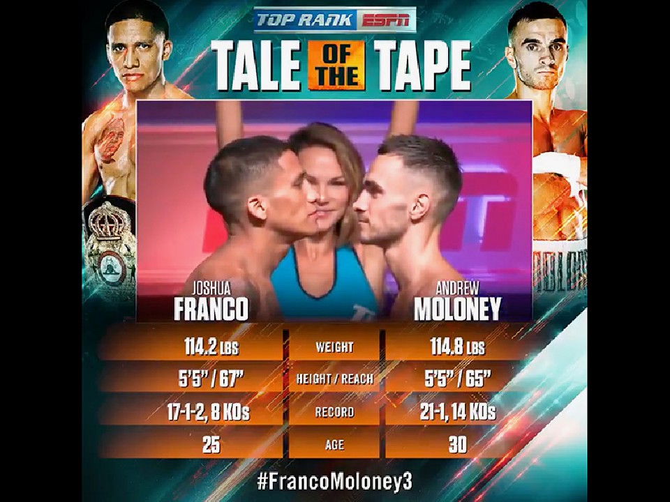これが3度目の対戦となるフランコvsモロニー。昨年6月の対戦は、11回にダウンを奪ったフランコが判定勝利で世界初載冠。11月のリマッチではフランコが右目を負傷して2回終了無効試合となった。しかし、その後にパンチによる負傷とモロニーがネバダ州アスレチック・コミッションに声明を発表。最終的にはラバーマッチで拳での決着となった。