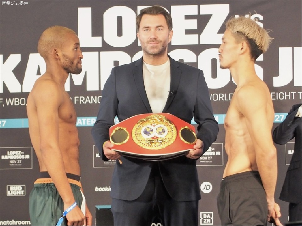 IBF世界スーパーフェザー級王座決定戦の前日計量が日本時間の26日、ニューヨークのマジソン・スクエア・ガーデンのHuluシアターにて行われた。計量会場は試合会場と同じ中ではなく、会場の入口にあたる場所だった。