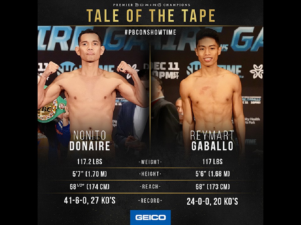 米国・カリフォルニア州カーソンのディグニティ・ヘルス・スポーツパークで11日(日本時間12日)、WBC(世界ボクシング評議会)バンタム級王座統一戦が決行される。日本時間の11日、同胞対決で注目を集めている正規王者ノニト・ドネア(39=米)と暫定王者レイマート・ガバリョ(25=フィリピン)が前日計量の秤の前で対峙した。