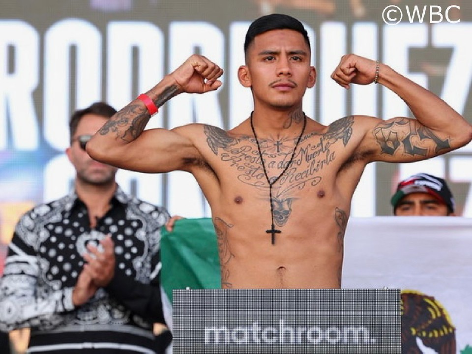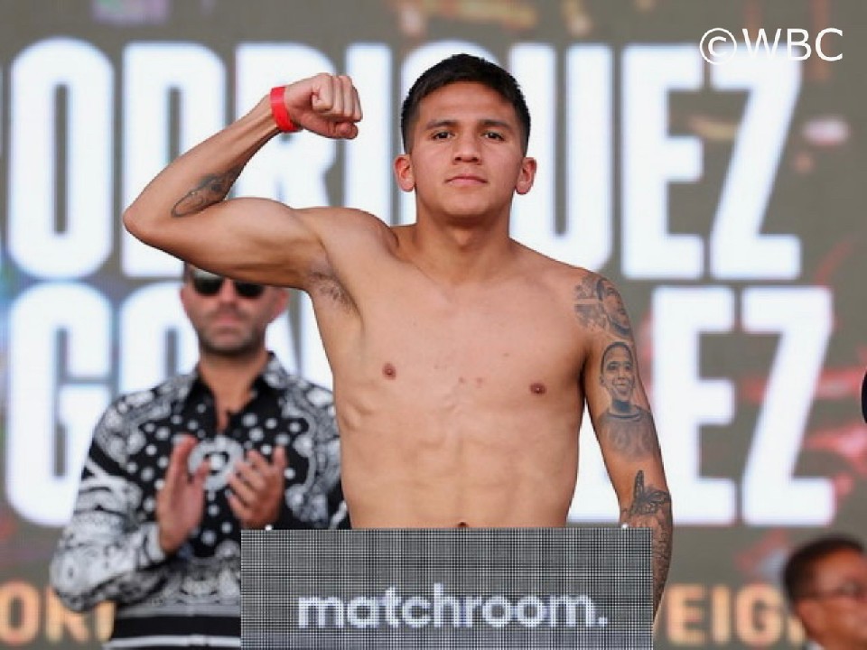初防衛戦に臨むチャンピオンのジェシー・ロドリゲス・フランコ(22=米国)は、114.8lb(52.07kg)で計量をクリア。右腕の力こぶを見せて、順調ぶりをアピールした。