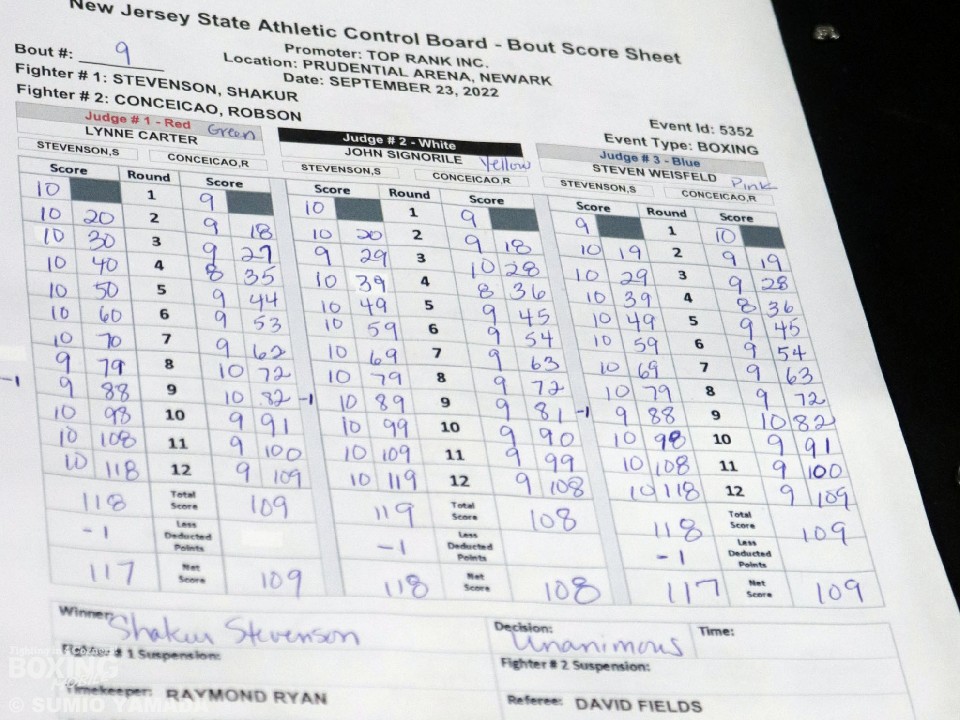 2本のスーパーフェザー級王座を失うも、全勝をキープ。今後は、ライト級へ上げることを改めて明言したスティーブンソンの戦績は、19戦全勝(9KO)。2度目の挑戦も実らなかったコンセイソンは、19戦17勝(8KO)2敗とした。