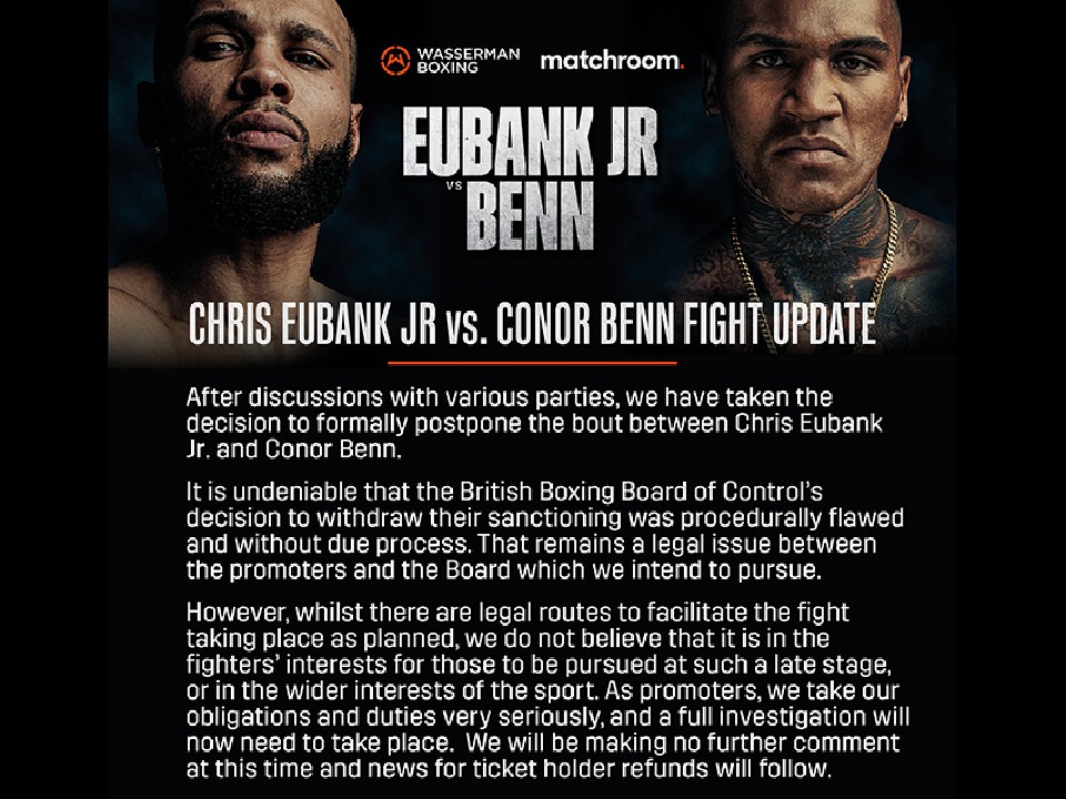 ファイトウィークの最中、ドーピング検査で禁止薬物が検出されたベン、この報告を受けた英国ボクシング管理委員会(BBBofC)が、試合承認をしないことを発表。これに対して、このイベントを取り仕切るマッチルームボクシング社は、試合開催の強行姿勢を見せていたが、その後、プロモーターのエディ・ハーン氏が試合の延期を発表、日程はまだ未定とした。試合チケットは、販売開始と同時に完売するなど、注目の対戦カードだった。
