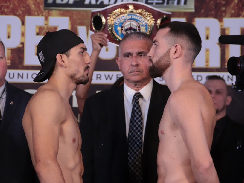 スーパーライト級リミット63.5kgを、ロペスは400g少ない63.1kgでクリア。マルティンは、100gアンダーの63.4kgでパスした。