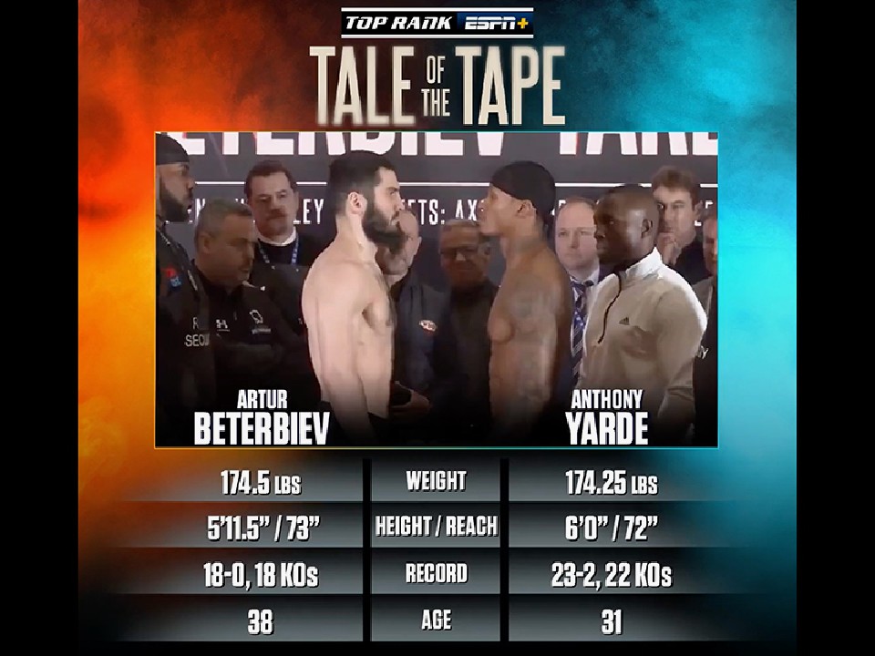 WBC・IBF・WBO 3団体ライトヘビー級統一王者のアーサー・ベテルビエフ(38=露)が28日(日本時間29日)、WBO同級1位、WBC・IBF3位の挑戦者アンソニー・ヤード(31=英)の地元、英国・ロンドンで防衛戦に臨む。現地時間の27日、前日計量が行われ両選手が秤の前で対峙した。