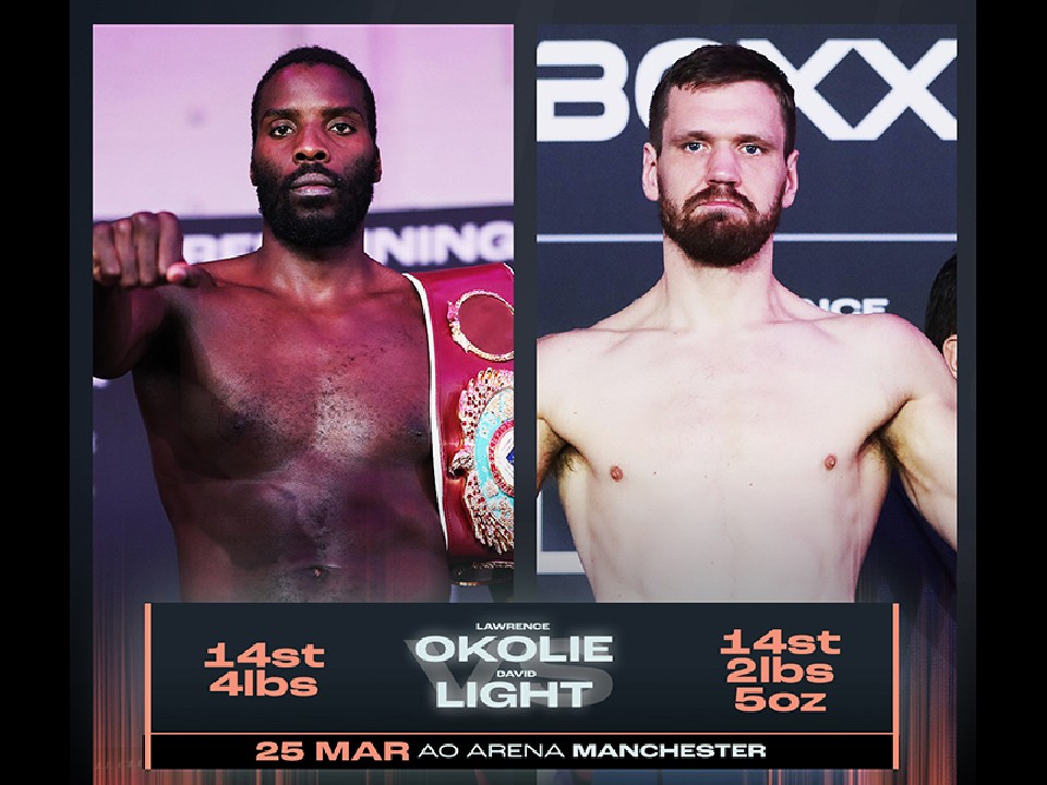 WBO(世界ボクシング連盟)クルーザー級タイトルマッチの前日計量が24日(日本時間の25日)、英国・マンチェスターで行われた。3度目の王座防衛戦となるチャンピオンのロレンス・オコリー(30=英)と、同級1位のデビッド・ライト(31=ニュージーランド)の対決に、世界の注目が集まっている。試合は25日(日本時間26日)、マンチェスター・アリーナで行われる。