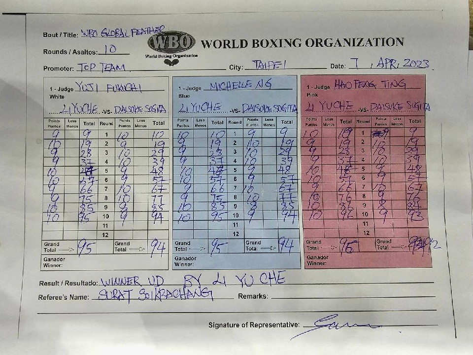 4月7日、台北市内の圓山花博流行館で行われたWBO(世界ボクシング機構)グローバル・フェザー級王座決定戦では、杉田ダイスケ(34=ワタナベ)が台湾プロボクシング界期待のリ・ユーチェ(29=台湾)と、共に流血を被る激しい攻防を繰り広げた。