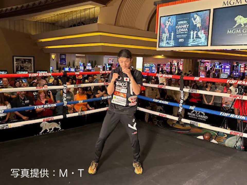 WBO世界スーパーフライ級王座決定戦で、世界2階級制覇を目指す中谷潤人(25=M・T)が18日、米国ラスベガスのMGMグランド内のカジノに特設されたリングで、シャドーボクシングを披露した。
