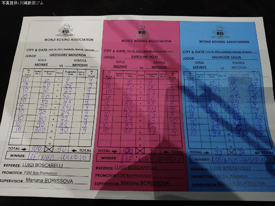 日本女子フェザー級王者の三好喜美佳(39=川崎新田)が日本時間25日、ドイツ・ロステックでWBA同級3位のニナ・マインケ(30=ドイツ)と、空位のWBA(世界ボクシング協会)女子ゴールド・フェザー級王座を争った。