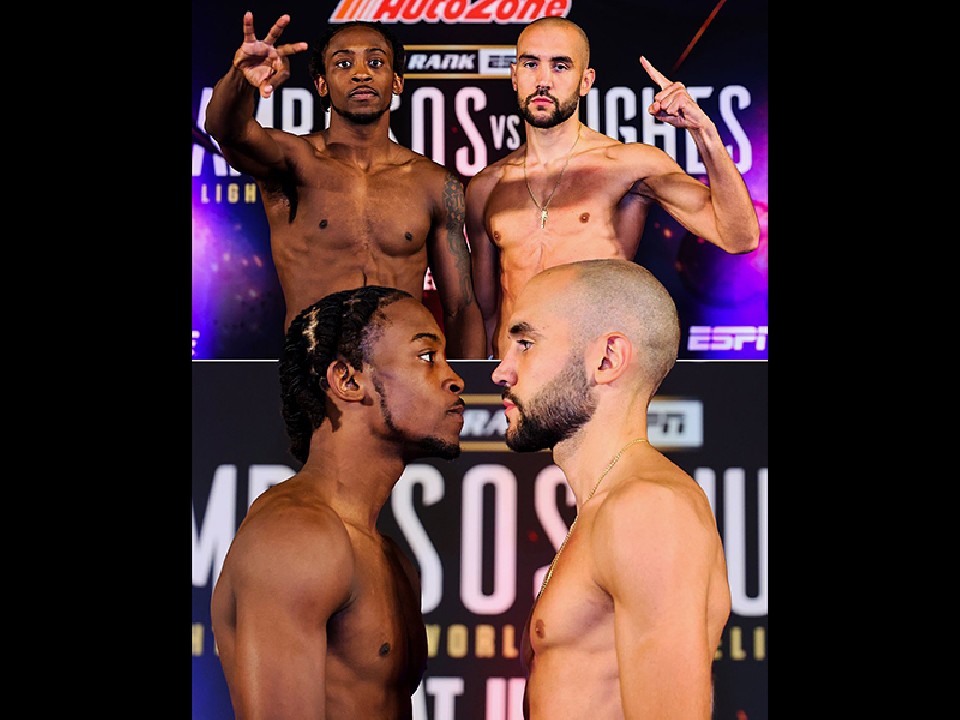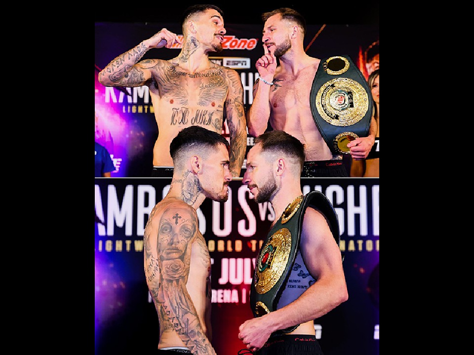 米国・オクラホマ州ショーニーのファイアーレイク・アリーナで、22日(日本時間23日)、IBF(国際ボクシング連盟)ライト級挑戦者決定戦が決行される。その前日計量が行われ、前ライト級4冠統一王者ジョージ・カンボソス.Jr(30=オーストラリア)と、IBF同級9位のマキシ・ヒューズ(33=英)が秤の前で対峙した。