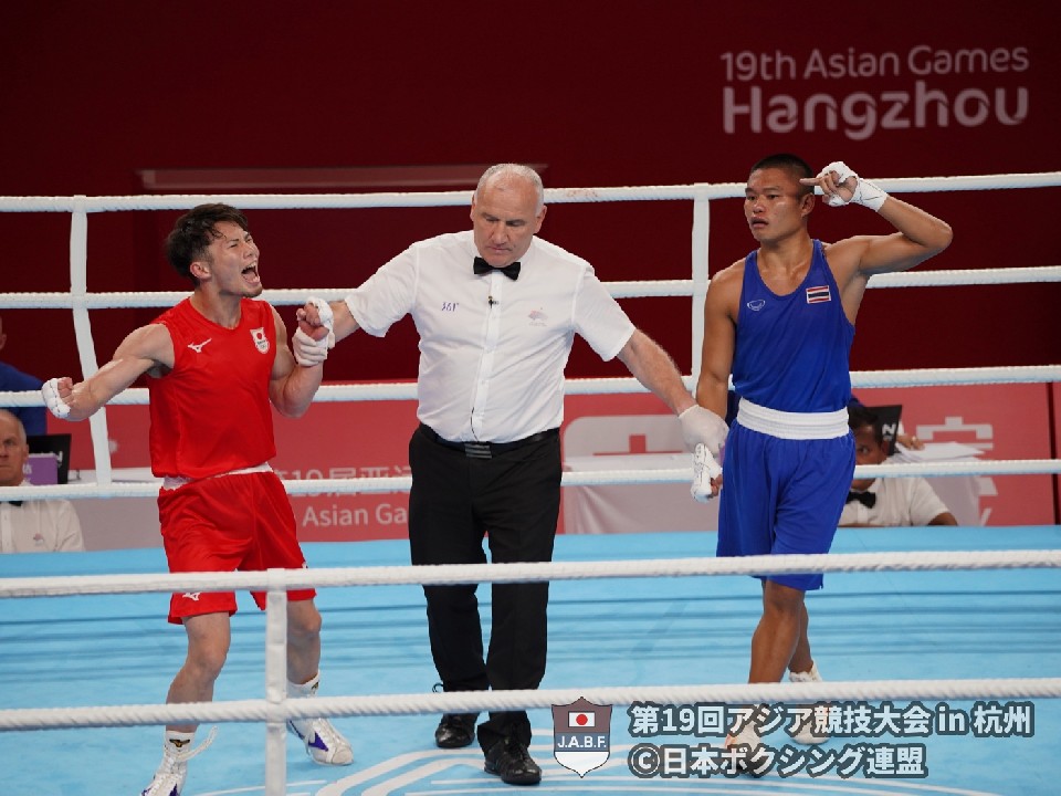 男子57kg級・原田周大(専修大学)はラジャクラン・ジュントロン(タイ)に判定3-2で勝利し、決勝へ進出。この勝利により、パリ五輪への出場権も獲得した。原田はインタビューエリアに来るなり「最高!」と雄たけびをあげ、「今まではペース配分を誤って、最終回にスタミナ不足で焦っていたけど、今回は中盤までに“遊び”を加えたので、2回終了時に同点と聞いて、このスタミナなら勝てると思った」と振り返った。ボクシング競技の最終日となる10月5日には、原田の決勝戦も行われる。