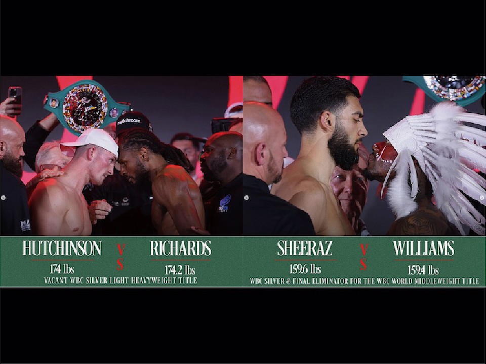 WBCシルバー戦、ライトヘビー級はリミット79.3kgを、王者ハッチンソンが400g軽い78.9kgでクリア。対する挑戦者リチャードは300gアンダーの79.0kgで秤を降りた。