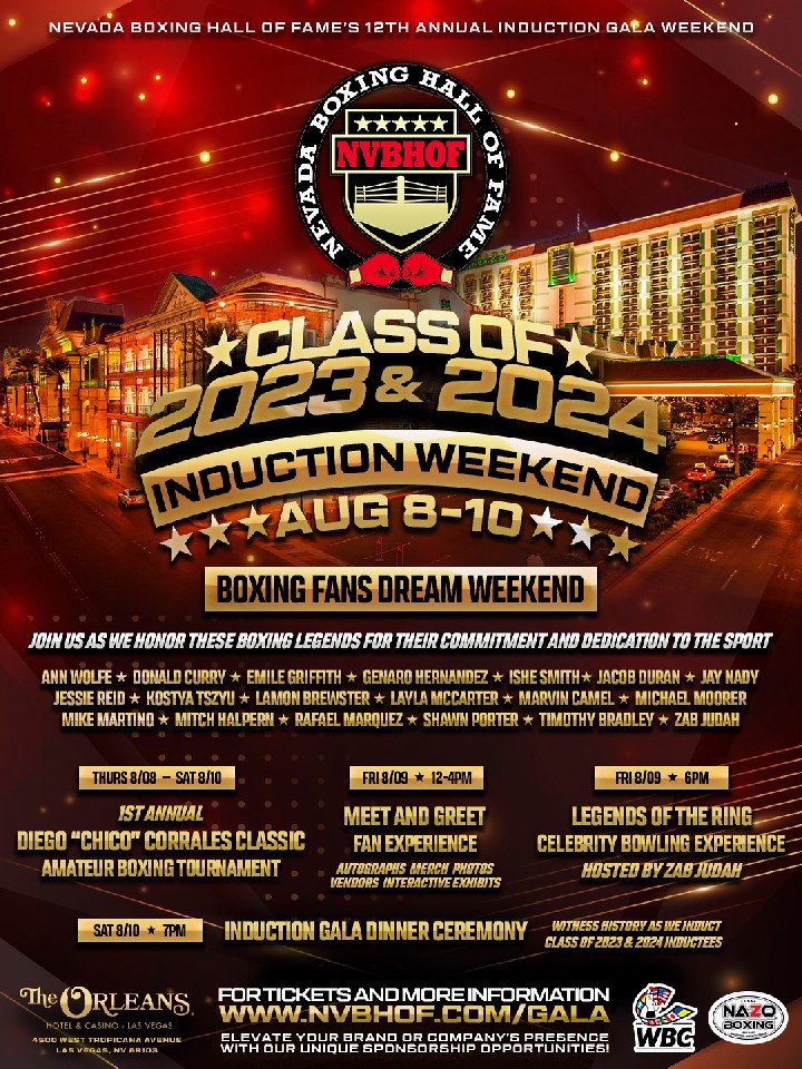 WBC(世界ボクシング評議会)が配信した16日のプレスリリースで、ネバダボクシング殿堂が、2023 - 2024年の殿堂入りを果たすレジェンドたちを発表したことが伝えられた。今年は、8月8日から10日まで開催される式典の参加申し込み者のための特設サイトが用意されている。