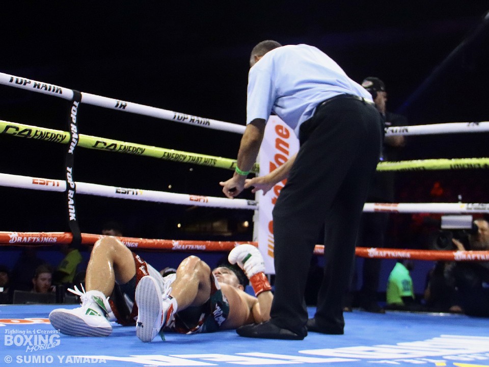 中盤、ロペスは随所でアッパーを打ち込むと、レオも右フックを当てて前進した。激しいパンチの交換がある中、レオは右フックでペースを掴むと、迎えた10回、左フックをジャブのカウンターで決めて、ロペスは大の字でダウン。頭を強く打ちつけたロペスは立ち上がることができず、10カウント。