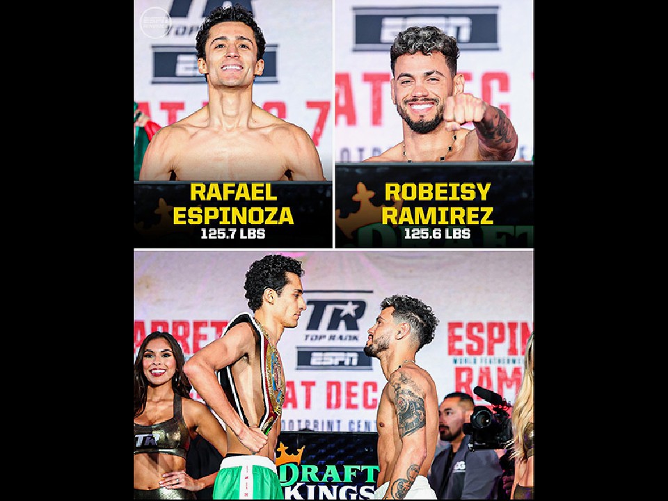 フェザー級リミット57.1kgを王者エスピノサは、100g少ない57.0kgでパス。前王者のラミレスは、200gアンダーの56.9kgでクリアした。
