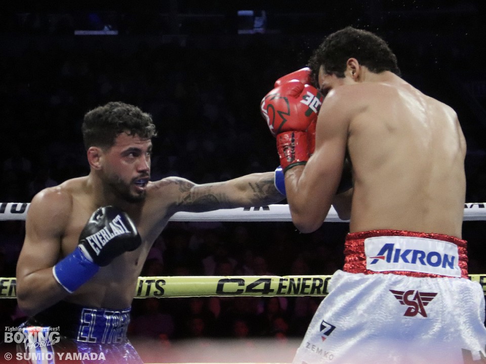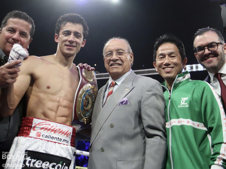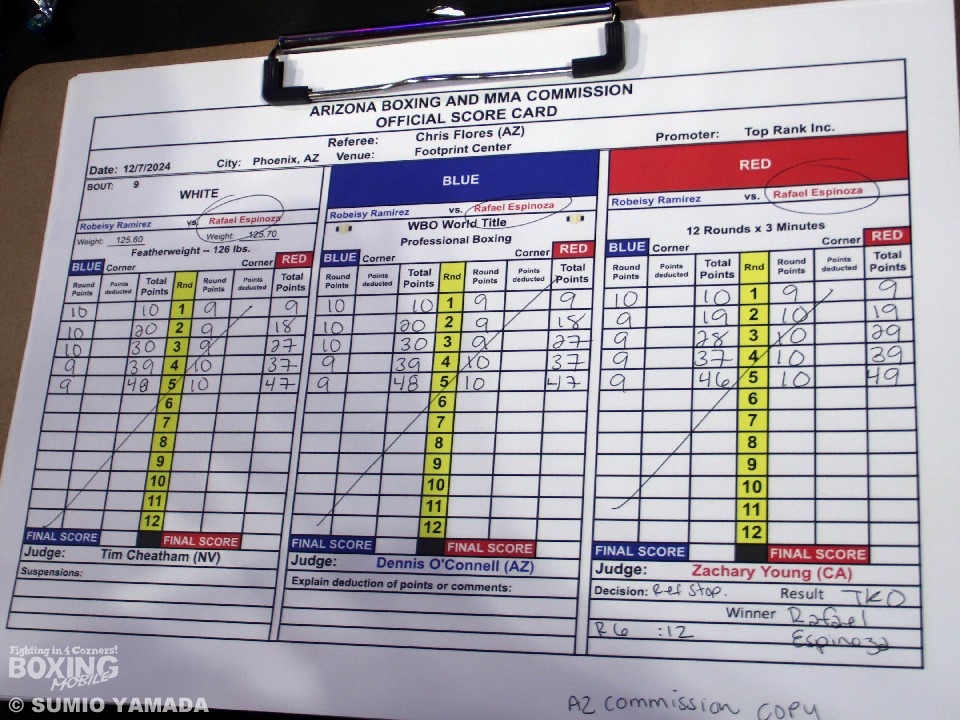 身長差20cmの再戦、王者エスピノサにはサポートで帝拳ジムの田中繊大トレーナーがついた。挑戦者ラミレス側には、チーフにイスマエル・サラストレーナーが入った。ラミレスが動いてボディを狙えば、エスピノサは長いジャブから右アッパーに繋げる序盤戦。中盤には互いにカウンターを打ち込み、エスピノサが次第に手数を増やす。すると、迎えた6回、開始後にエスピノサが右ストレートを打ち込むと、ラミレスが背中を向け棄権を示し、レフェリーがストップ。エスピノサが6回12秒TKO勝利で、2度目の防衛に成功した。