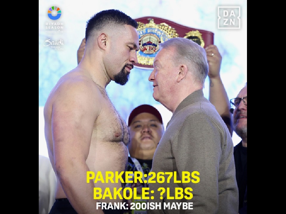 サウジアラビアのリヤドで日本時間23日、『リヤド・シーズン』が決行され、ヘビー級のトップ戦線がセット、前日計量が行われた。セミではWBOヘビー級暫定王者ジョセフ・パーカー(33=ニュージーランド)が、急遽、代役となったWBO同級2位マーティン・バコーレ(31=コンゴ)を相手に、暫定王座初防衛戦を迎える。