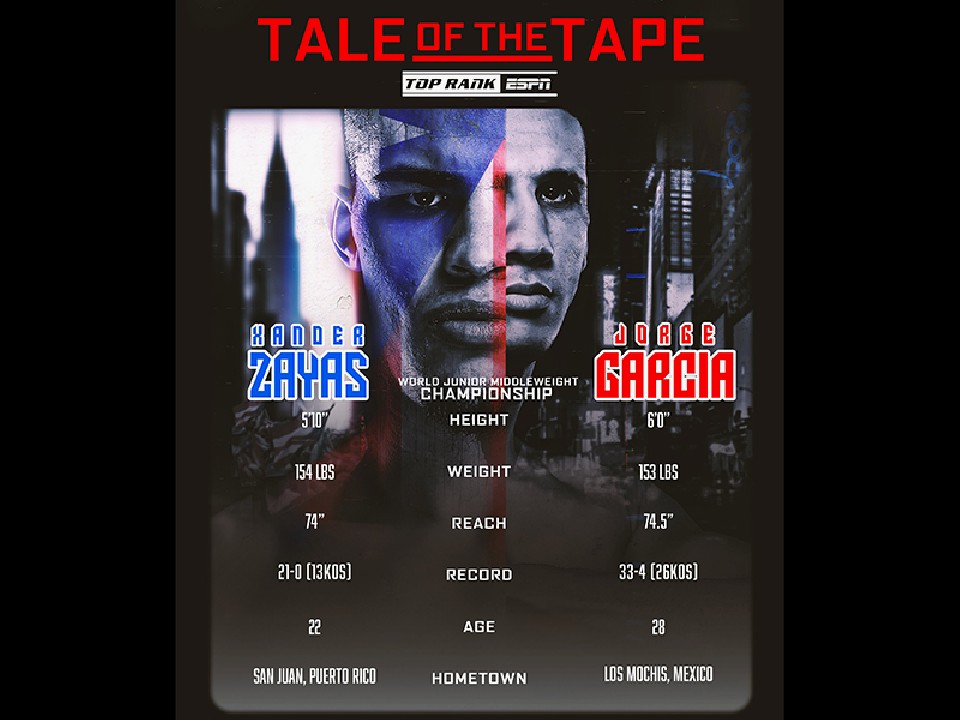 メインイベントでは、空位となっているWBO世界スーパーウェルター級王座を懸けた決定戦が行われ、同級1位のサンダー・ザヤス(22=プエルトリコ)と同級2位のホルへ・ガルシア・ペレス(28=メキシコ)が拳を交える。