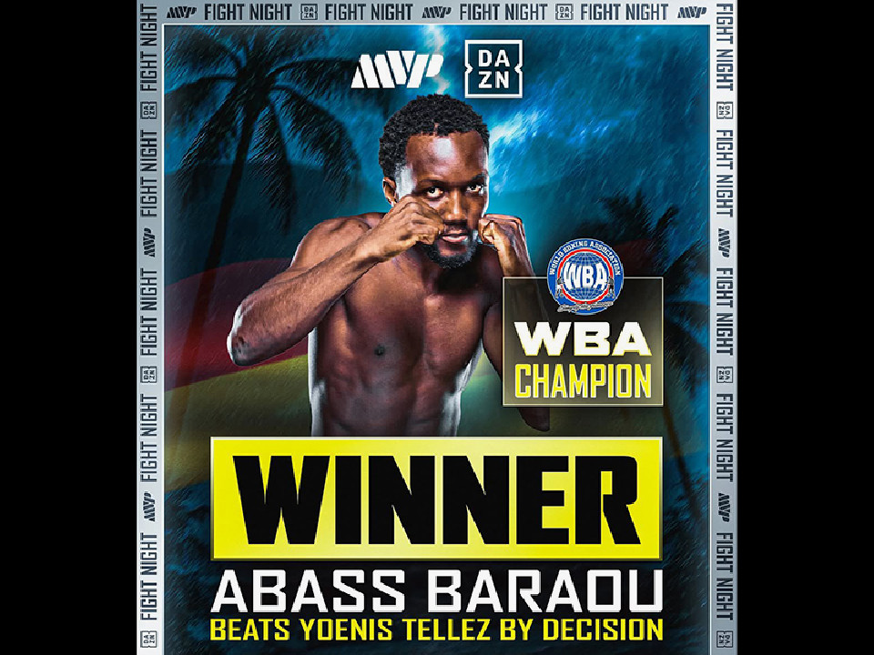 挑戦者バラオウがプレッシャーをかければ、サウスポーの暫定王者テレスは距離を取り、カウンターを狙う序盤戦。その後、バラオウが更に接近戦を仕掛けると、テレスもスイッチで応戦。終盤に入ると疲れを見せるテレスに対し、バラオウがインファイトから左フックをヒット。最終12回には、バラオウが左フックでダウンを奪い、攻勢のままで試合は終了。判定は3-0(117-110、116-112、115-112)で、バラオウが暫定ながら初の世界王座を獲得した。