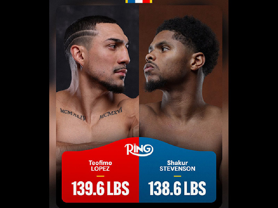 スーパーライト級リミット63.5kgを、王者ロペスは200g少ない63.3kgでパス。対する挑戦者スティーブンソンは600gアンダーの62.9kgで秤を降りた。