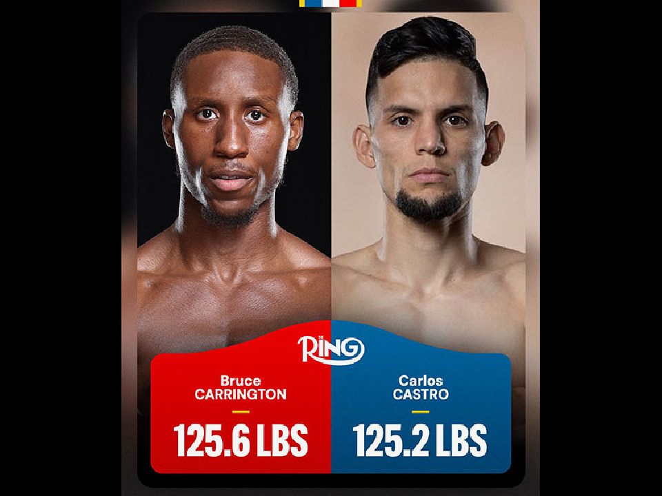 フェザー級リミット57.1kgを暫定王者カーリントンは100g軽い57.0kgでパス。対するカストロは300gアンダーの56.8kgでクリアした。