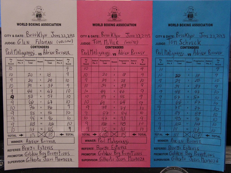 手数ではマリナッジが勝り、有効打と強打ではブローナーが上回ると試合だったが、新王者誕生は間違いないところと思われた。しかし、判定は2対1に割れた。意外なことにジャッジのひとりが115対113でマリナッジの勝利を支持したのだ。残る二者が115対113、117対111でブローナーを支持したため大きなトラブルに発展することはなかったが、不穏な空気が漂ったのは事実だ。