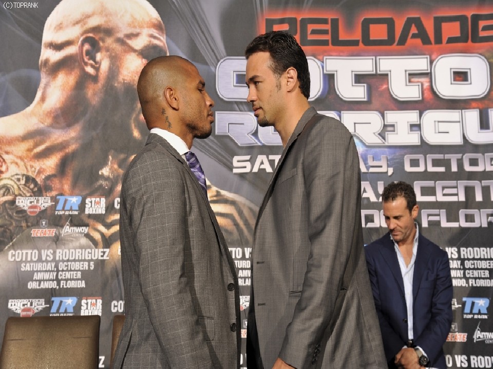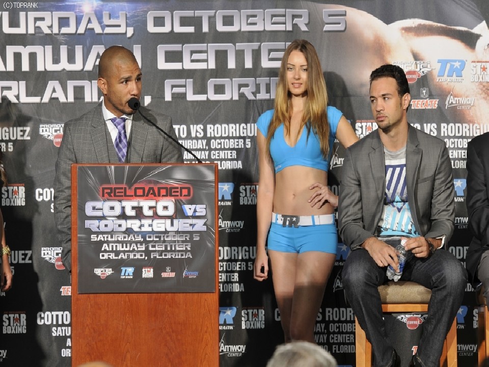 元世界3階級制覇王者ミゲール・コット(32=プエルトリコ)と、スーパーウェルター級の世界ランカー、デルビン・ロドリゲス(33=ドミニカ共和国/米)の試合が10月5日、米国フロリダ州オーランドで行われることが正式決定した。23日には両選手が揃って会見に臨んだ。