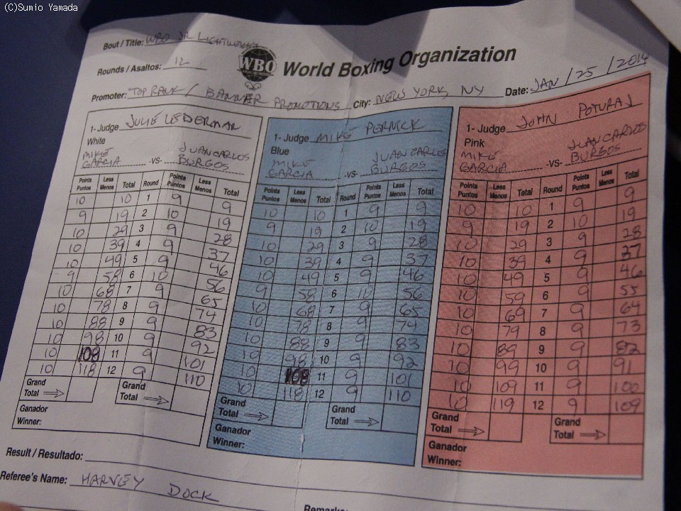 3回から左ジャブを多用したガルシアはペースを奪回し、以後は毎回のようにポイントを重ねていった。結局、手数でも大きく挑戦者を上回ったガルシアが118対110(二者)、119対109という大差でジャッジ三者の支持を取りつけ、初防衛に成功した。