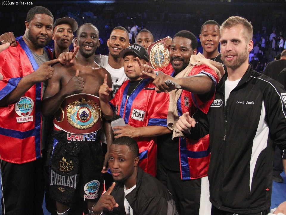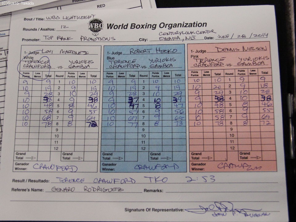 オマハで開催された42年ぶりの世界戦に集まった1万超の観衆は、地元のヒーローの逆襲にお祭り騒ぎのように湧き立った。これを機に形勢は王者に傾いた。スタンスを左構えに変えるなどしたクロフォードは8回にもダウンを追加、圧倒的優位に立った。9回、最初にチャンスをつかんだのはガンボアだったが、勢い込んで攻めて出たところにクロフォードの左を浴び、この試合3度目のダウンを喫した。それでも立ち上がって再開に応じたガンボアだったが、今度は右アッパーを突き上げられ4度目のダウン。これを見たジェナロ・ロドリゲス・レフェリーはノーカウントで試合をストップ、王者のKO防衛となった。クロフォードは24戦全勝(17KO)。スター選手が揃う中量級戦線の核になる可能性が出てきた。一方、04年アテネ五輪覇者でもあるガンボアは、プロ転向後24戦目にして初の黒星(23勝16KO1敗)となった。