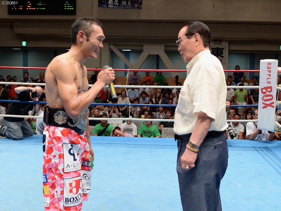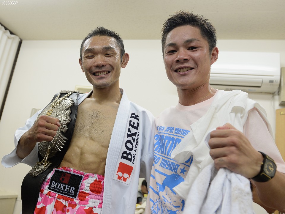 会見終了後に、「防衛に成功したら車を買ってもらえる約束をした」という村中優(F赤羽)が、満面の笑みで控室を訪れ益田を祝福した。益田は、「中古の軽自動車で」と交わしながらも握手を交わし笑顔を見せた。