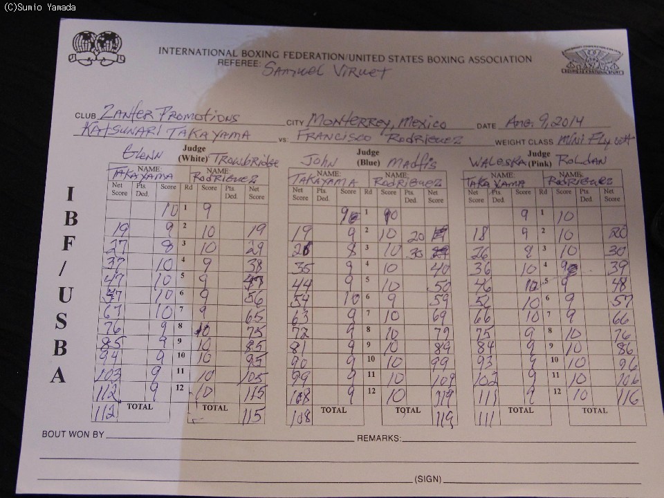 採点は二者が116対111、115対112と中小差だったが、もうひとりは119対108の大差だった。3度目の防衛と統一、そして4団体目の王座獲得を逃した高山は35戦27勝(10KO)7敗1無効試合。統一を果たすとともにWBO王座の初防衛に成功したロドリゲスは17戦15勝(10KO)2敗。「右の拳を痛めてしまい痛くて打てなかった。体重もきついので上のクラスに行きたい。今日は試合中に負けるかと思ったが、気力でタイトルを勝ち取ったと思う」とコメントした。