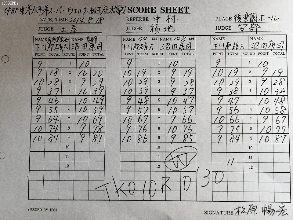 初回からアウトボクシングに徹して、慎重に試合を進める下川原に対し、プレスを強め左右のフックを散らす沼田。4ラウンド終了時の採点ではどちらもリードを奪えなかった。下川原の左に対してカウンターを合わす沼田は、徐々にペースを握り始めると8ラウンド終了時の採点では2-0と優勢に終盤戦を迎えた。今年3月の死闘から数えて22ラウンド、63分30秒。ロープに追い込んだ沼田が連打を打ち込み、下川原が右目を痙攣させたところで、レフェリーが試合を止めた。