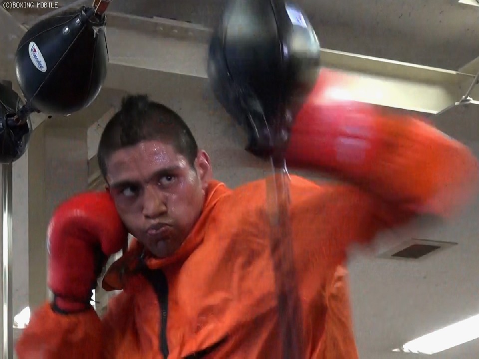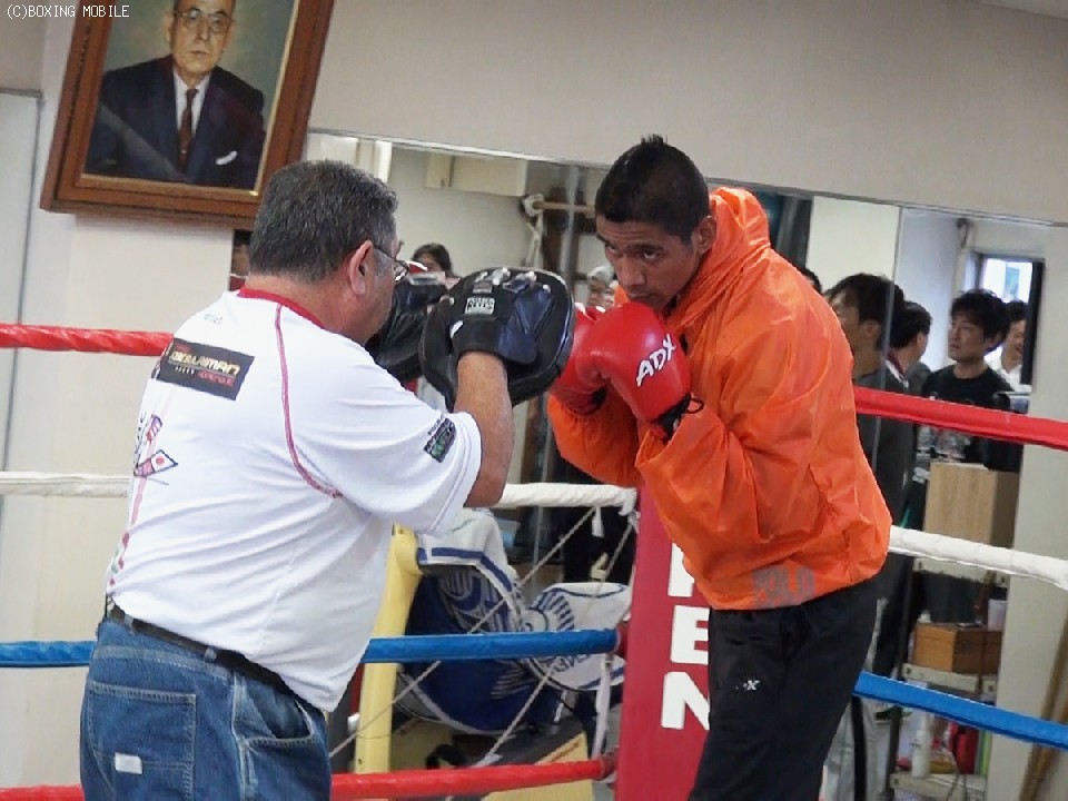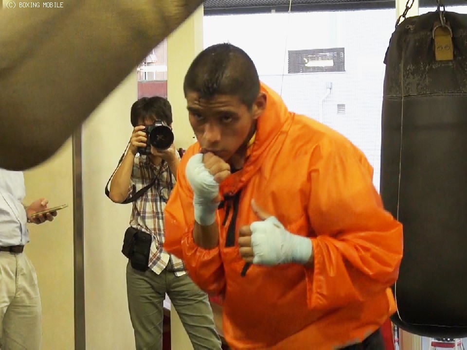 ジムワークでは、かつてアントニオ・アギーレ(メキシコ=元世界ミニマム級王者)らを指導したハコボ・リオス・トレーナー(61=メキシコ)とのミット打ちを1ラウンドだけ披露した。「私はスピードがあるし、バリエーションも豊富」と自己分析していたが、ワンツー主体の正統派という印象を残しただけで、3分のミット打ちでは全体像をみせることはなかった。パンチングボールのダブル、シングルを打ったあとロープも飛んだが、186センチの長身ゆえロープが天井についてしまうため、バルコニーで飛ばなければならないほどだった。