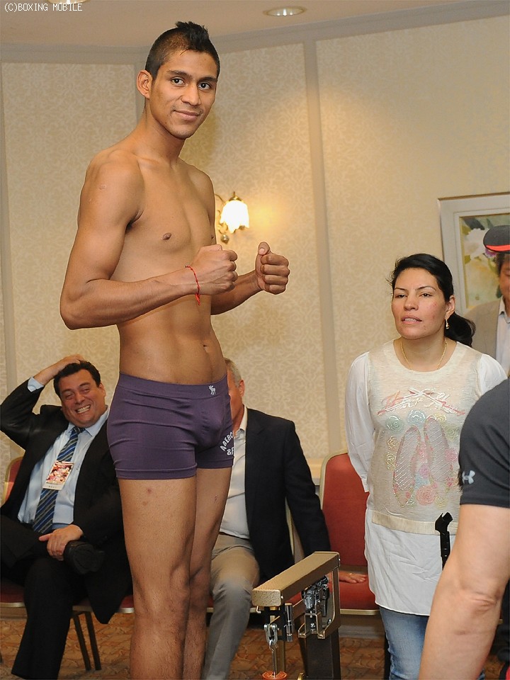 プロ5戦目、162ポンド契約10回戦に臨む村田はリミット73.5kgを下回る73.1kgでクリア。対戦相手のメキシコミドル級王者のアドリアン・ルナ(メキシコ)も73.4kgで一発パスした。
