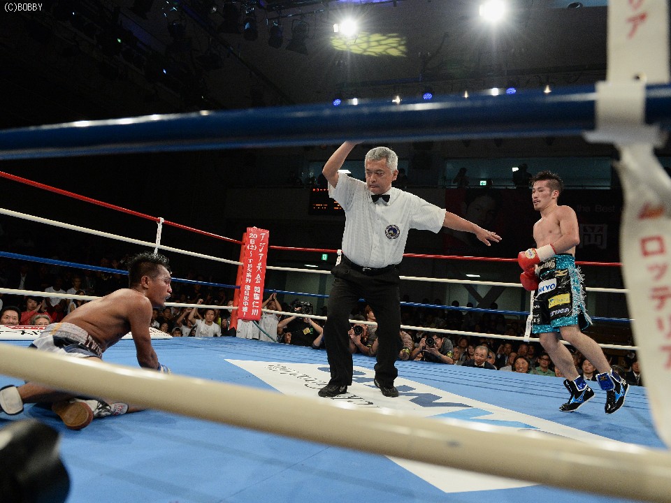 すると4ラウンドに入ると、宮崎が得意の右クロスから左右のボディでトビタを追い込み、続く5ラウンドも左フックから一気にリズムに乗ると、最後は右ストレート一発でトビタをキャンバスに沈めた。
