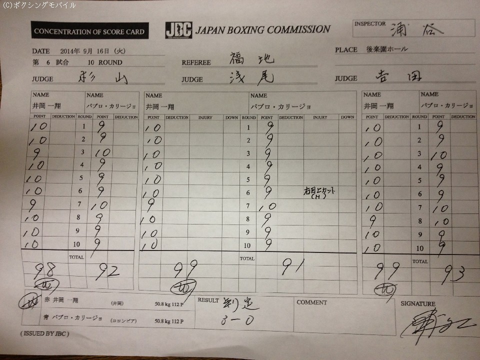 この試合はフライ級世界前哨戦と銘打たれ、井岡はWBA世界フライ級14位のパブロ・カリージョ(コロンビア)と対戦。これまでの速い出入りを持ち味としたスタイルから、前傾姿勢のクラウチングスタイルと圧力重視のボクシングに変化した井岡だが、カリージョも低く入っては細かいコンビネーションを当て、終始井岡の被弾が目立ってしまった。それでも的確さでは井岡が上回り、ジャブを効かせながら単発の右を各ラウンドでヒット。さらに終盤に入るとコンビネーションも機能し出し、リズムにのった井岡が完全に主導権を握る。相手の奮闘もあり、倒すことは出来なかった井岡だが、最大8ポイント差を付け、判定勝ちで再起を飾った。