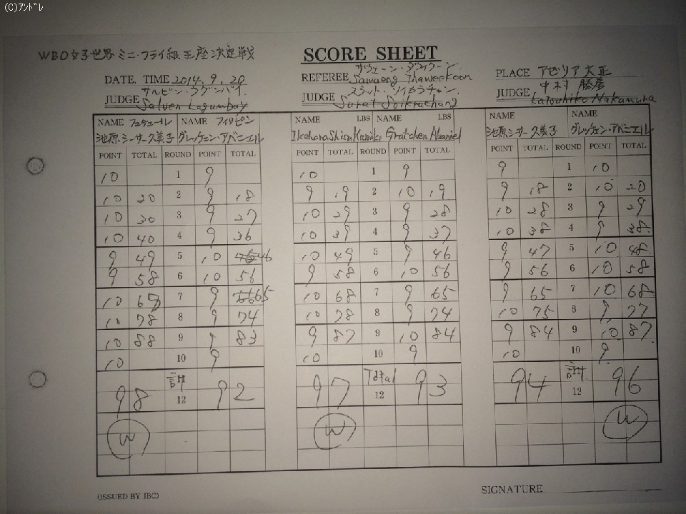 先手を取りに出た池原に対し、アバニエルは打ち終わりに回転の速い左右フックを立ち上がり。池原も回転では負けず、2ラウンド終盤には連打を浴びせ主導権を握る。アバニエルも時折カウンターを決めたが池原を崩せず、判定は最大6ポイント差をつけた池原が新チャンピオンに輝き、現役女子8人目の世界王者となった。