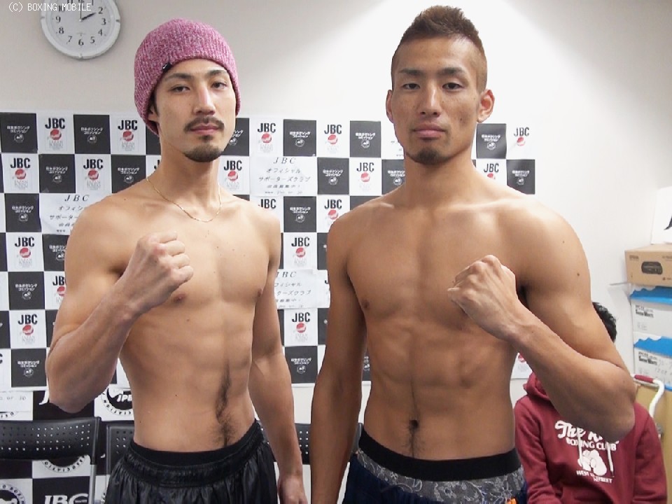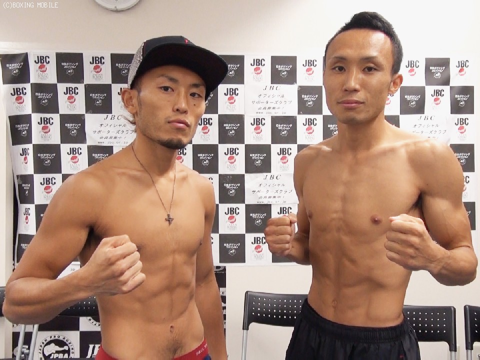 日本Sフェザー級タイトル戦の計量は、王者・内藤がリミットの58.9kg、挑戦者・江藤が200gアンダーの58.7kgでパス。