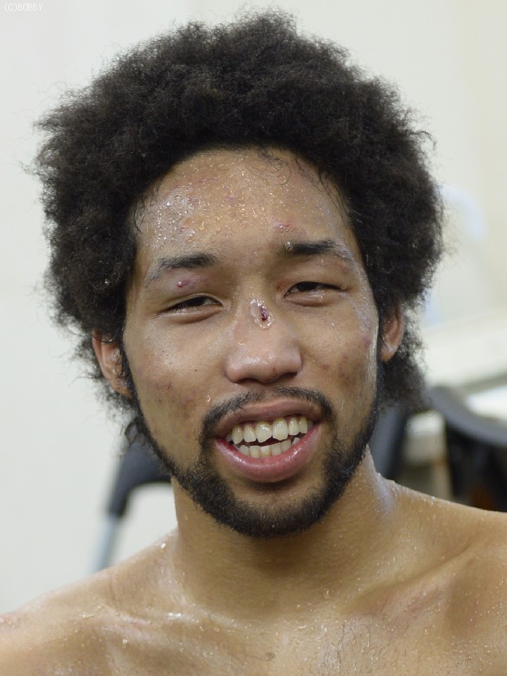 控室に戻った内藤は「疲れました。勢いのある選手だったので、そこにはまってしまった。最初にリズム乗れず、乗ったと思ったら6Rのフックで止まってしまった。7Rも効きました。もっと、ストレートを打ってくると思った。距離が遠かったし、低く入ってきたのが一番の誤算でしたね。鼻のカットは、折れたのかと思いました。アクシデントを乗り越えたという意味で、やって良かった試合でした。倒すことを意識し過ぎて、最初から勝負にいってしまった。あまり倒そうと思うもんじゃないですね」と試合を振り返った。