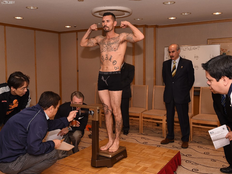 計量後、プエルタは早々と姿を消したが、鳥肉とニンニクのスープを飲み終えた三浦が囲み取材に応じた。「これからお粥を腹に入れ、今晩はご飯と200gのステーキを食べるつもり。コンディションは本当にベストな状態です。挑戦者と裸で向かい合い、闘志が沸いてきた。相手のタトゥーを狙いう打つ」とコメント。これまで比較的に冷静さを保ってきた三浦が、いよいよ臨戦態勢に入った。