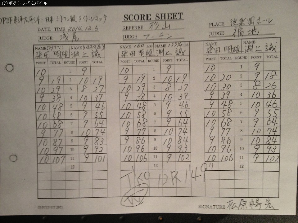 リベンジに燃える淵上を挑戦者に迎え、東洋太平洋と日本ミドル級の両タイトル防衛に成功した柴田は「前回より淵上選手のプレッシャーが強く、自分の足を生かすことができなかった。効いたパンチはなかったが、パンチのバリエーションも増えていて、ガードの上からの圧力もあってスタミナを削られた。左をもっと出したかったが、自分の右が当たっていたので、それに頼ってしまった。防衛はしましたが、不満の残る内容です」と反省しきりだった。