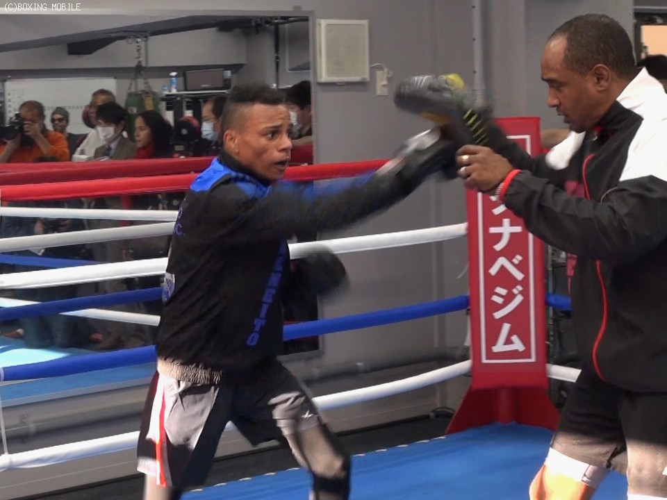 26日、WBA世界スーパーフライ級王者の河野公平(ワタナベ)に挑むノルベルト・ヒメネス(ペルー)がワタナベジムで公開練習を行なった。